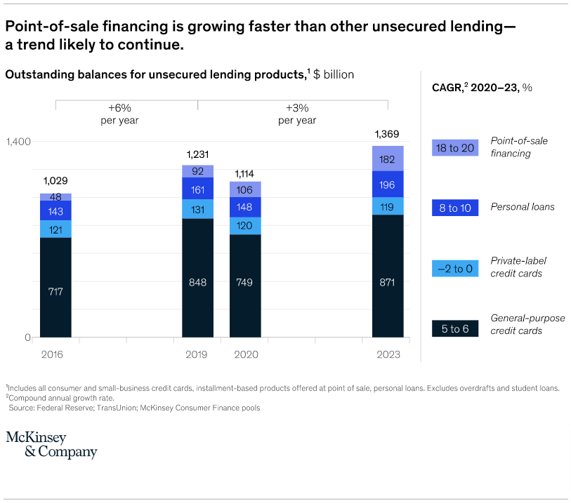 According to McKinsey, credit originating at point of sale (or “BNPL credit”) represented only seven percent of unsecured lending balances in the US in 2019.